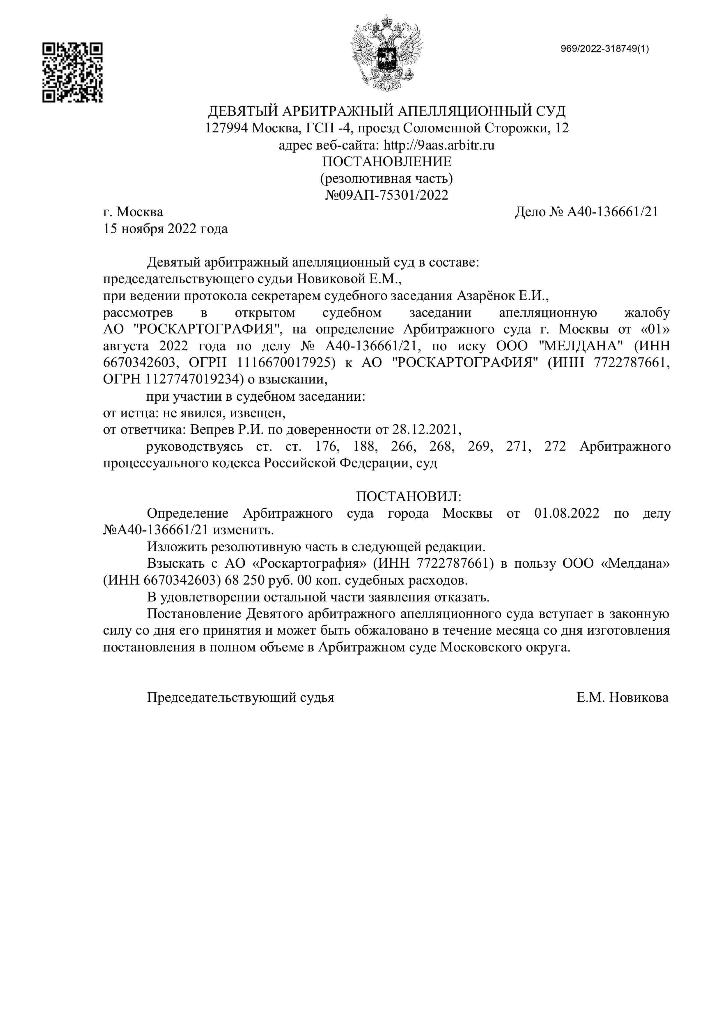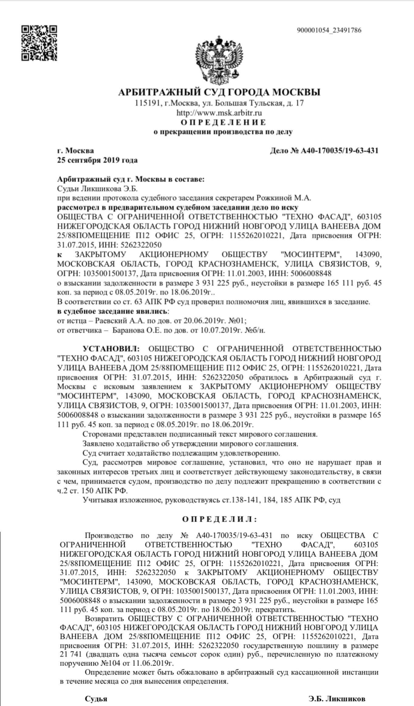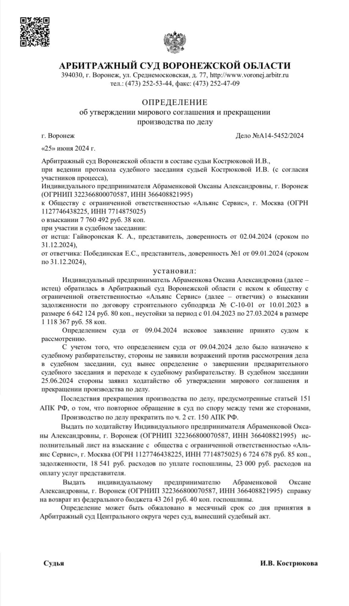 4. Заключили выгодное мировое соглашение, по которому клиент получил задолженность, неустойку и компенсацию юридических расходов.
